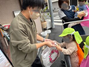 いつもお世話になっている地域の方々にお菓子をもらいに行くのにあいにくの雨で心配していましたが、なんと!子どもたちがお菓子をもらいに行く予定の時刻には一時的に雨がやみ、お菓子をもらいに各クラス出発しました! 0歳児クラスは保育園の隣と園長先生にもらいに行き、おやついる人ー?と聞くと「はーい!」と元気いっぱい手を上げる姿が見られました。