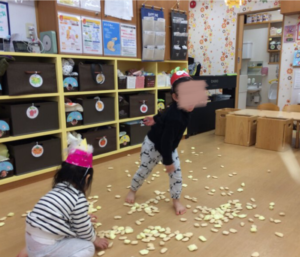 豆まきでは、鬼=怖いものではなく、節分の「邪気を払う」という意味合いを知ってもらえるよう、「みんなのお腹(心)の中にいるイヤイヤ鬼やおこりんぼ鬼をやっつけよう!」というねらいで豆まきを行いました。「しあわせな鬼こーい!(福は内)」という掛け声を一緒にしたりもし、子どもたちも楽しんで豆を投げ合ったり、一斉に撒いたりしていましたよ!