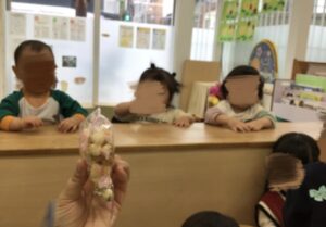 「どうぞー」「おもちです~…パクッ!」と、0歳のお友達も手振りを真似して一緒にやってくれていました♩